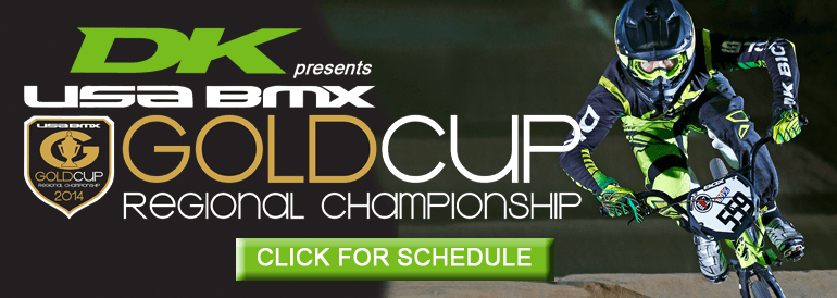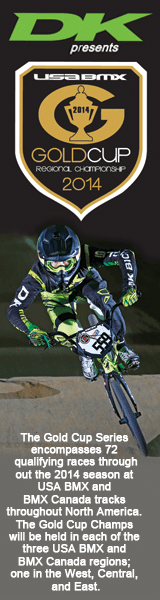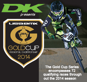 The American Bicycle Association is pleased to announce DK Bicycles as the presenting sponsor of the Gold Cup Series. The Gold Cup Series encompasses 72 qualifying races throughout the 2014 season at USA BMX and BMX Canada tracks throughout North America. The Gold Cup Championships will be held in each of the three USA BMX and BMX Canada regions; one in the West, Central, and East. To be eligible for Gold Cup awards, racers utilize scores from their best two qualifiers as well as the finals.